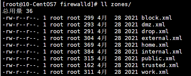 firewall-cmd存在helpers、icmptypes、ipsets、services、zones等预定义的结构,是用xml文件预定义在系统中的。可在/usr/lib/firewalld/下查看。