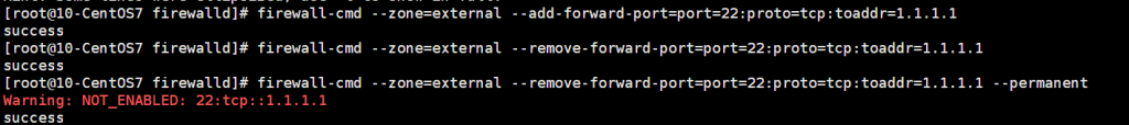 firewall-cmd --zone=external --remove-forward-port=port=22:proto=tcp:toaddr=1.1.1.1